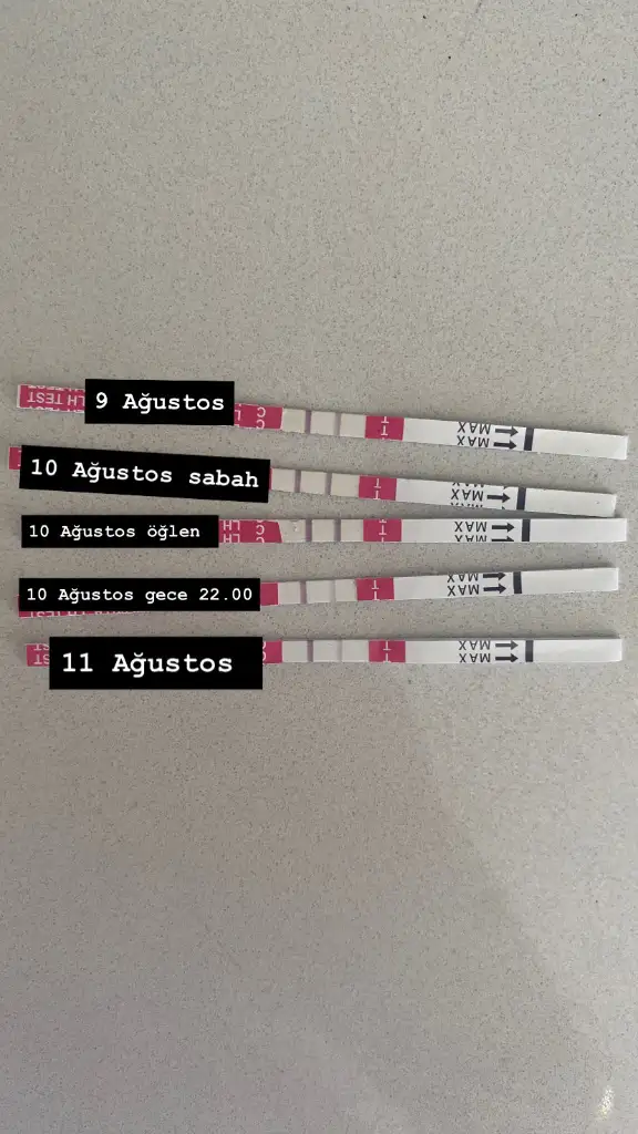 Kızlar merhaba. Testlerim bu şekilde çıktı . 10 Ağustosu 11 ağustosa bağlayan gece değerlendirdim. Yani 11 Ağustos gece 01.00 da değerlendirdim sadece . Hamilelik ihtimali var mıdır yoksa geç