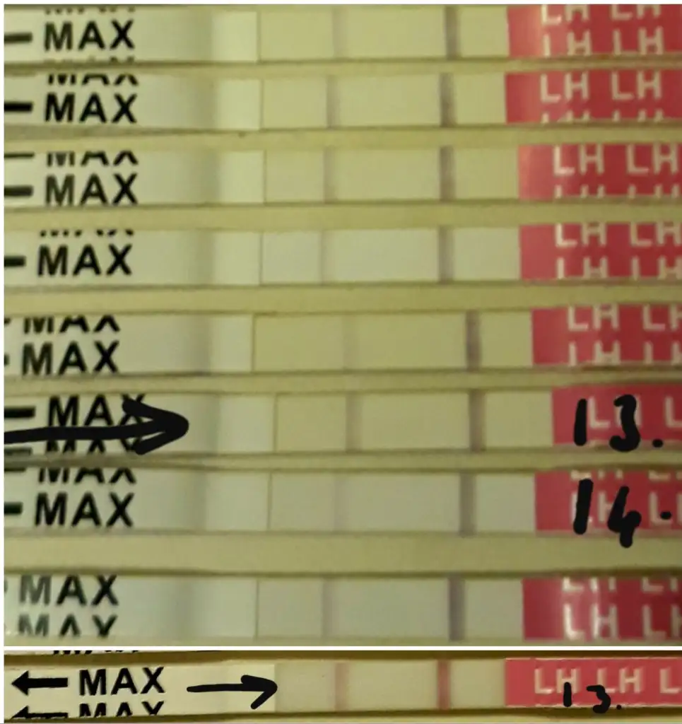 9.günden beri ovülasyon testi yapıyorum. Adetim 27 gün sürer. Resimde 13.günde ilk defa koyu kırmızıydı, ama ertesi güne pik olur herhalde dedim. Bu işaretlediğim testi de sabahtan yaptım. Ilk yaptığım halini de en aşağı ekledim. Tahmini yumurtlama tarihinden 1 gün öncesi. Sonra uzun süre yapamadım. Yaptığımda da silik çizgi çıktı iyice. Sonra en altın bir üstündekini de yaklaşık 3 saat su içmeden akşam yaptım. Yine çok belirgin değildi. Sizce işaretli olan pik miydi, değil miydi? Kafam karıştı. Daha belirgin olmasını bekliyordum ama bunu gördükten sonra da uzun süre yapamadığım için belki daha koyulaştı ve çatladı diye yorumladım. Test uzmanlarının görüşleri nedir? 😂