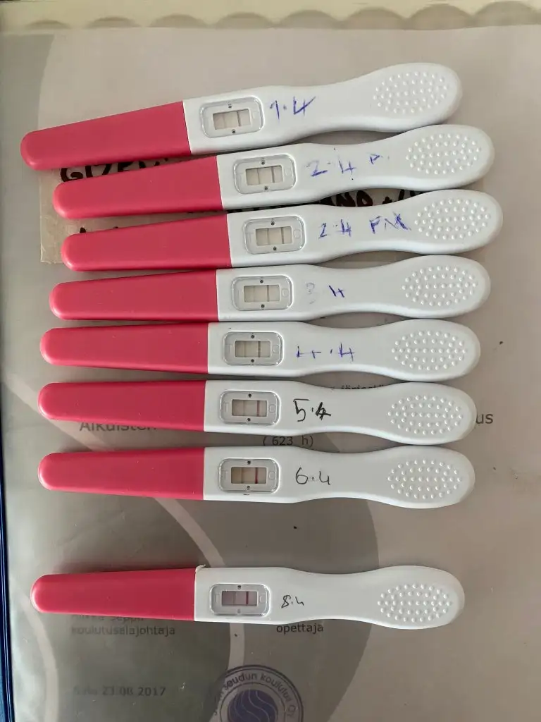 1 Nisan'dan beri test yapiyorum, fakat 7 Nisan'da testim bitmis eczanelerde kapaliydi ve alamdim :( 7'si kacti maalesef. 2. attigim foto ayin 8'i. Bana öyle geliyor ki 7'si sanirim pik olmus (?) Cunku 6 Nisan'da koyulasti ve simdi 8'inde acilmaya basladi...