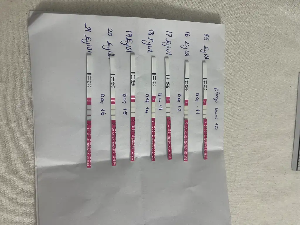 bu ay ovulasyon testi ile takip etmeye basladim normalde 28 gunluk dongum var 22 agustos leke seklinde regl geldi daha sonra artti 27 agustosta leke seklinde reglim bitti. Normalde yumurtlama 14. gun oluyor ama benim ovulasyon testleri biraz sasirtti 31 agustosta piki yakaladim bugun 1 eylul ve neredeyse gorunmeyecek sekilde silik bir cizgi cikti. Sata gore bu yumurtlama icin cok erken degil mi? Anlayanlar lutfen yardimci olabilir mi