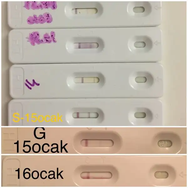 Slm lütfen bilgisi olan yazsın yaa...sat 22aralık yasmin kullanmistm 28.gün gelmisti adetim.5.gün cocuk icin klomen kullandim 3ocakta catlatma iğnesi.iğneden 15.gün erken gebelik testi yaptm negatif.4 gündür falan adet olcakmısım gb hafif ağrım oluyor ve sari renk akıntm var.burda duymustum ovulasyon testide gebeligi gosteriyor diye.merak ettim.şimdi sat tan 30.gün ve iğneden 17.gün sabah 11 gb ovulasyon testi yaptm 2.çizgi hafif silik ama bayağı belirgin.normalde tam nezamn adet olucam bilmiyorum 22 ocağımı beklicem.ama bi teste kafam karıştı 2.cizginin çok silik veya hic olmaması gerekmiyormuydu.test resmini koydum