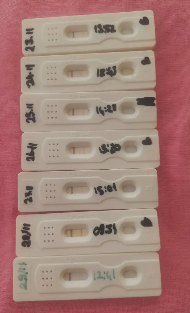 Herkese merhaba son yaptığım testleri fotoğraf olarak ekliyorum arkadaşlar bir gebenin günlüğü dünkü yaptığım test ilk başta pembeydi sonra koyulasmis fotoda göründüğünden daha koyu ama ne zaman koyulasmis bilmiyorum sizce pik mi oldu