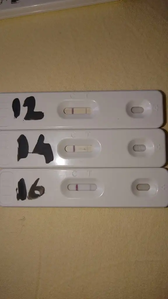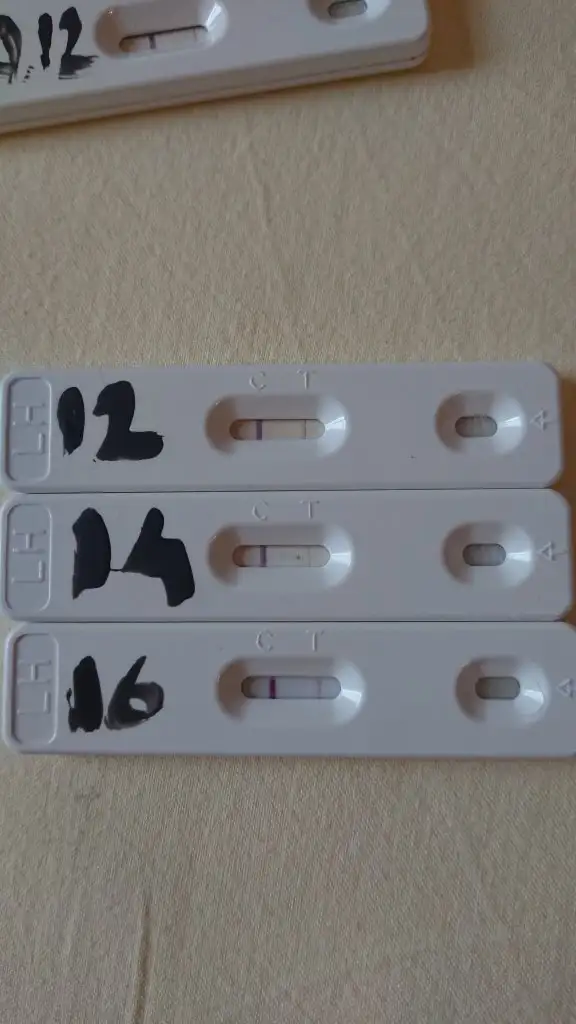 Reglime 1-2 gün kala ovu testim en alttaki, bi önceki yaptığım çok çok silikti ışıkta zor görünüyordu. Sizce 14den 16ya koyulaşma var mı? Dün akıntı oldu krem renginde gün boyu, şuanda da acayip bel ağrısı ve regl olacak gibi kasık ağrım var. 2 testte de sıvı tüketimine aynı şekilde dikkat ettim