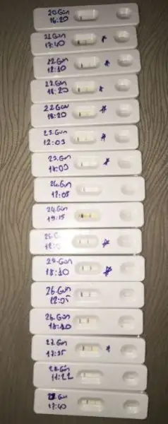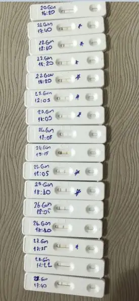 mayıs ve 27 haziranda ovulasyon testim pozitif çıktı.14 gün sonra adet olacagımı varsayarsak dün falan olmam gerekiyordu ama bütün belirtileri taşımama rağmen hala olamadım bi ovulasyon testi daha yapayım dedim bayagı koyu cıktı ekteki gibi..bu durumu yasayan var mı acaba