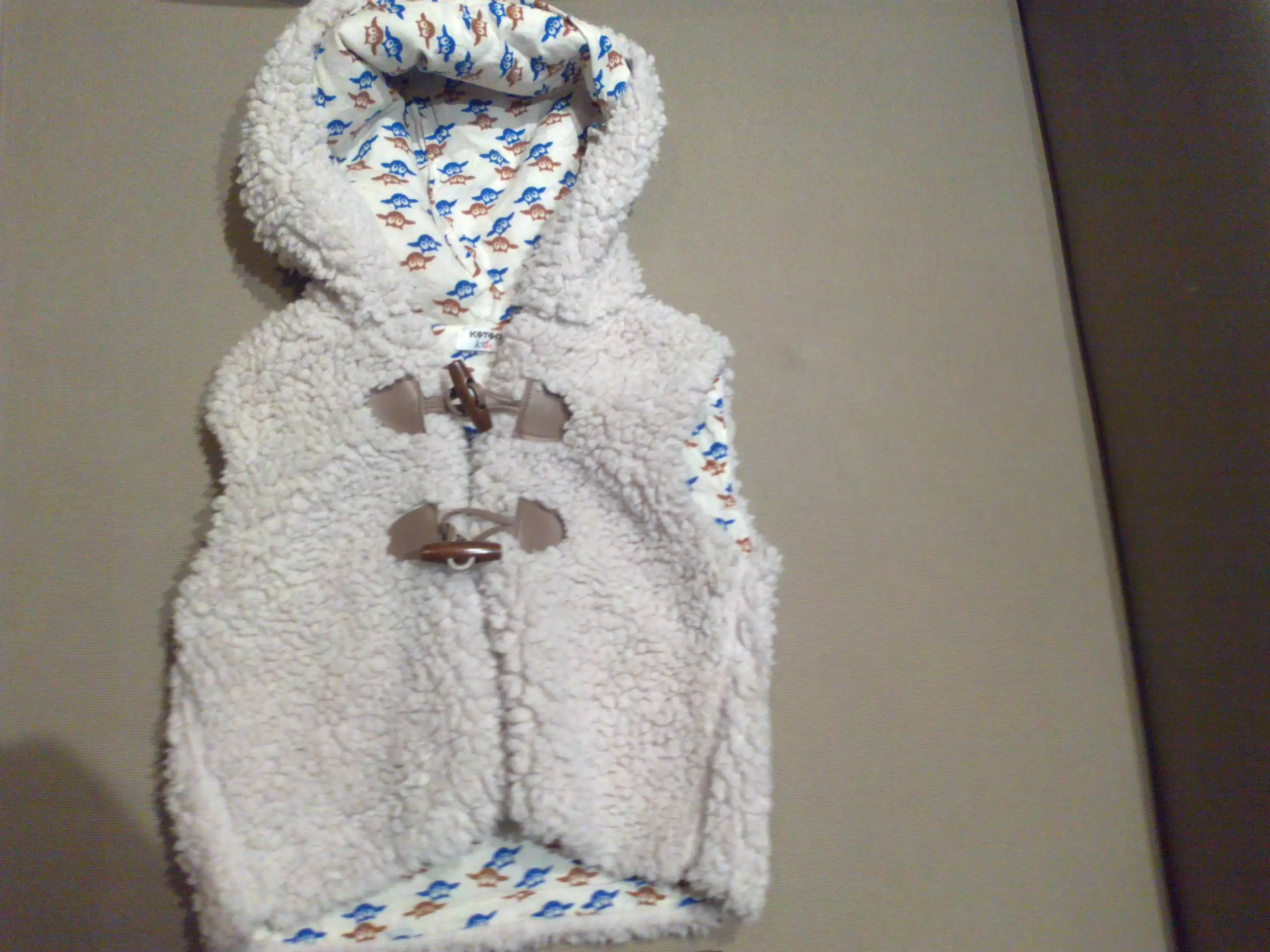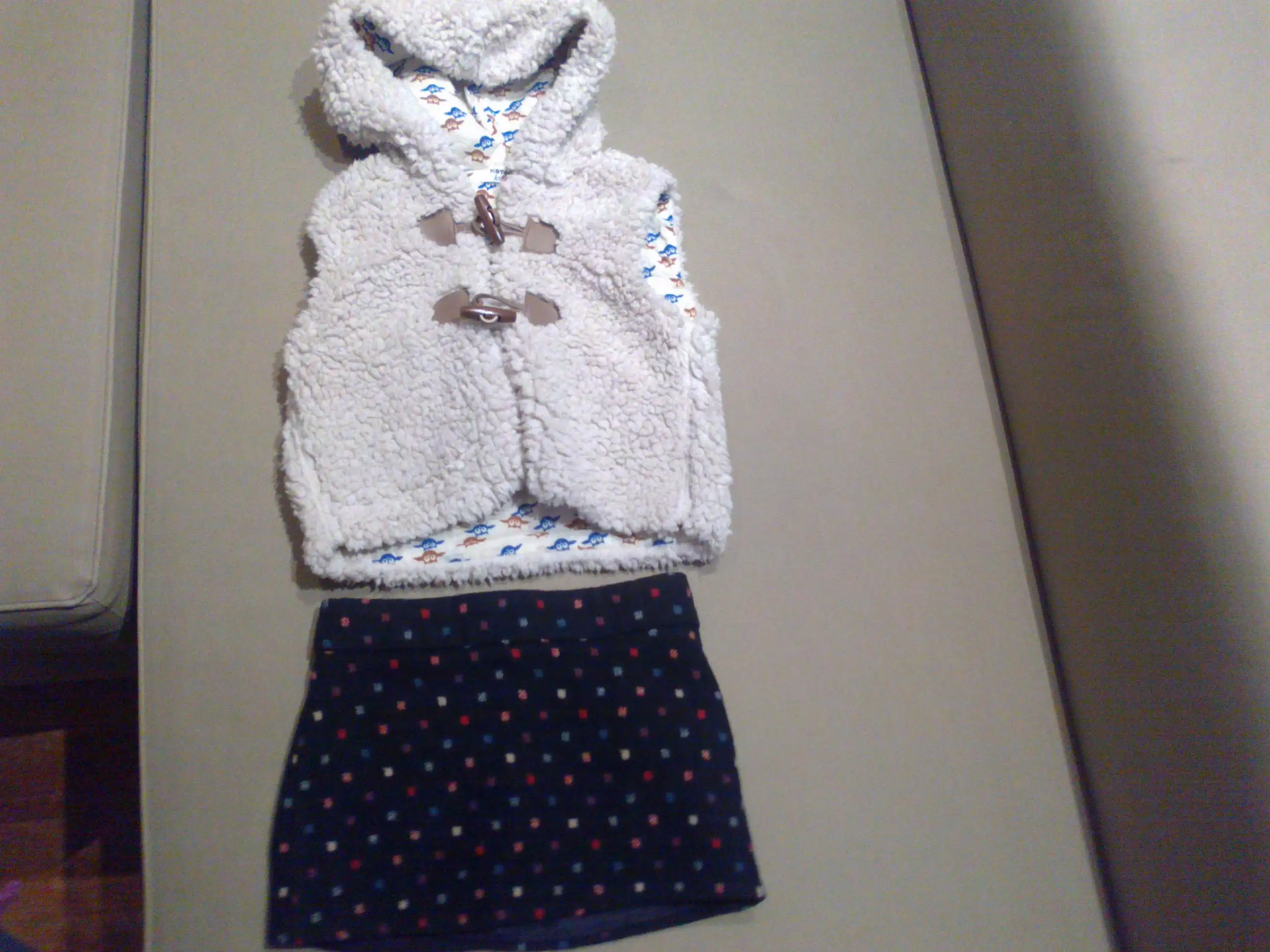 Foto 12,13 : Koton marka kalın yelek ve etek.Etiketini keserseniz yelek çift taraflı da kullanılabilir.Bir tarafı koyun yünü,bir tarafı renkli yarasa desenli,çok şirin.3-4 yaş etiketli ama dar kalıp,2-3 yaşa uygun.