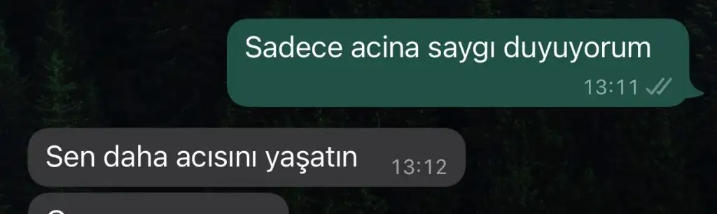 Ona göre ben ona evlat acısında daha acısını yaşatmışım, oyle dedi mesajında. Bana hakaretler beddualar etti mesajda, ben de sadece acina saygı duyuyorum diye cevap verdim. Sen bana daha acısını yaşattın dedi