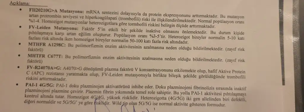 Yok benimkinde hiçbir açıklama yoktu sadece yanında homozigot yazıyordu. Yanlız burda yüksek risk derken bacağa veya kalbe pıhtı atarak damar tıkamasından söz ediyor. Faktör 5 ve 2 dışındakilerin düşük ile ilişkisi yokmuş, onların ilişkisi de çelişkiliymiş. Çoğu doktor bunu bizim psikolojimiz rahat olsun diye veriyor, gerek olduğundan değil. Ya da anneyi korumak için. O kadar araştırma yaptım ki. Yine de içim rahat etmiyor işte. Bi doktor buna annelik içgüdüsü dedi tüm hamileler böyleymiş, bi kere kötü bişey duydular mı ne desen vazgeçiremiyorsun içlerinde şüphe kalıyor dedi. Aynen o moddayız.Teşekkür ederim amin inşallah. Coraspini sormuştum ben de, yarılanma ömrü diye bir şey söylediler, iğne daha etkiliymiş galiba. Tedirginseniz hiç atlamayın yaptırın doz testini rahat edin. Ama en azından erken düşük riski dönemini atlatmışsınız, çok da stres yapmayın olumlu düşününbu arada size verilen raporda yazıyor muydu bilmiyorum ama benimkinde şu şekilde açıklamalar mevcut.