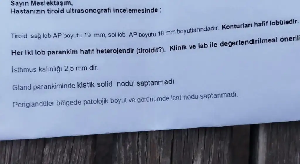 Troid de ve lenflerinde nodül yokmuş bu iyi birşey ama troidid yazan şey troid iltihabı yani hasimato olarak geçiyor. Ben de hasimato hastasıyım çünkü.. endişe edicek birşey yok. Kan değerlerinde tiroid değerlerine ve antikor degerlerine bakarlar.