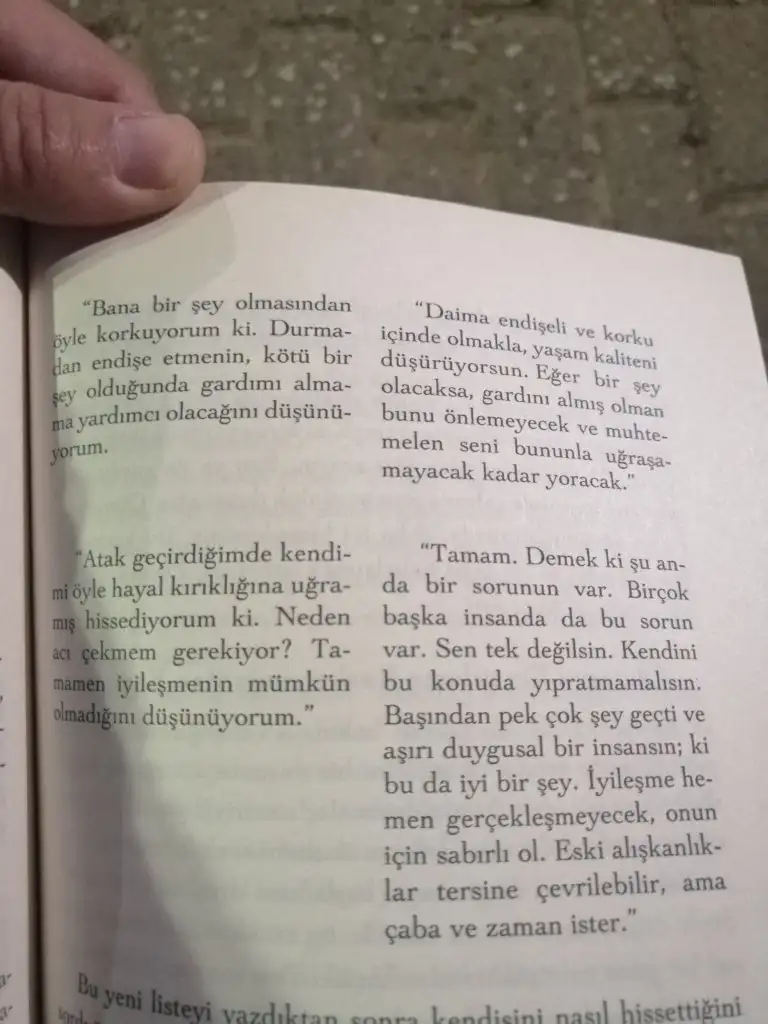 Aşırı sinirlilik haliyle ilgili doktorumla konuştum az önce tatilde yaşadığım panikatakları da değerlendirdi. Hiç kötü değilsiniz Niloya hanım dedi o kadar yol gitmişsiniz cesaret edip yola çıkmışsınız atak da gelebilir gelmeyecek diye birşey yok dedi bazı hastalarım var hastanenin çevresinden ayrılamıyor bırakın şehir değiştirmeyi evden çıkmıyorlar dedi. O yüzden o gelen atakları kafaya takmayın dedi öfke ve sinirlilik halim için şuan Risperdal 1 mg ın yarısını gece yatmadan evvel dedi. Aslında ilaç almasanız da olur dedi ama ben çok kötüyüm diye ısrar edince terapiye kadar içelim gelince değerlendirelim dedi.