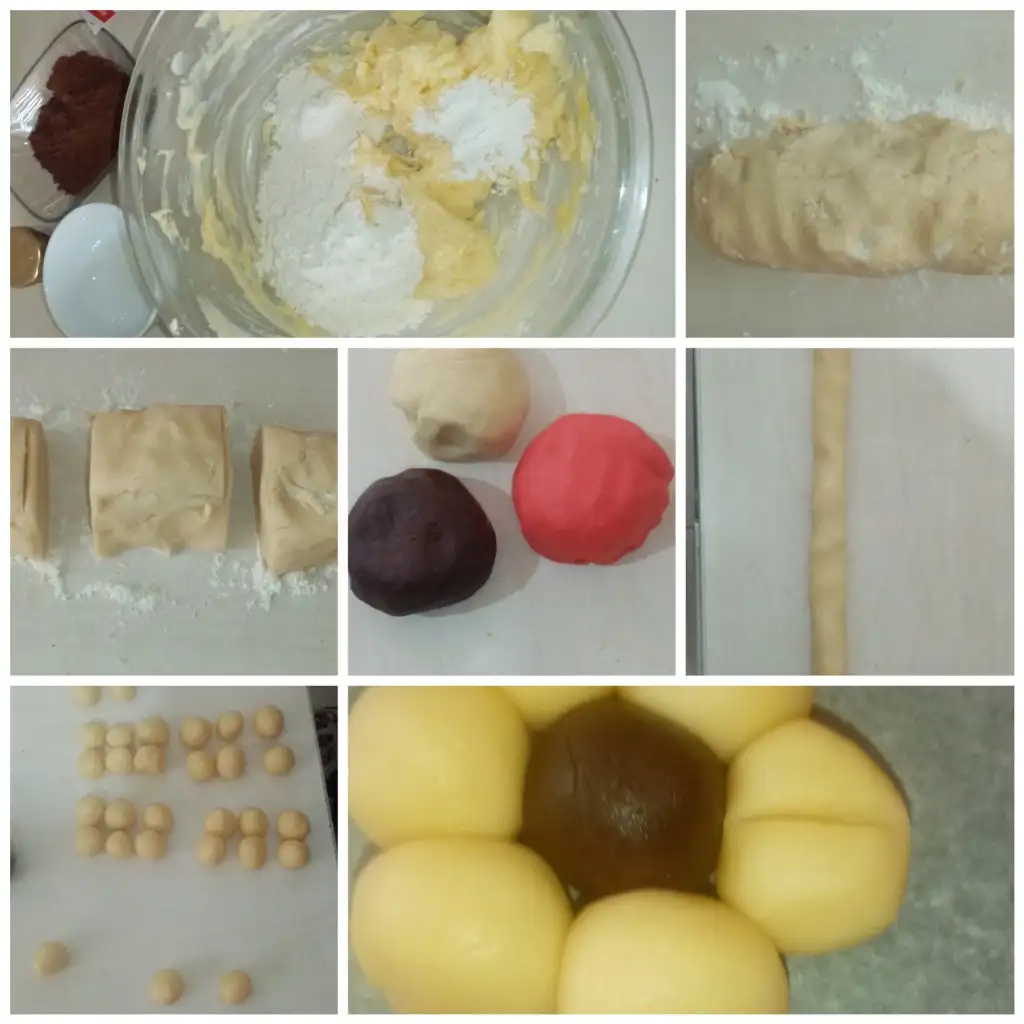 Ben Hamuru 3 renk yapacağım için 3e ayırdım. Daha sonra sade kakao ve pembe olan hamurlarımızı fındık büyüklüğünde kesip yuvarlıyoruz 7 yuvarlak ayırıp Papatya şeklini yapıp kürdan yardımı ile yapraklara bastırıp hazır olan papatyaları fırına atıyoruz.