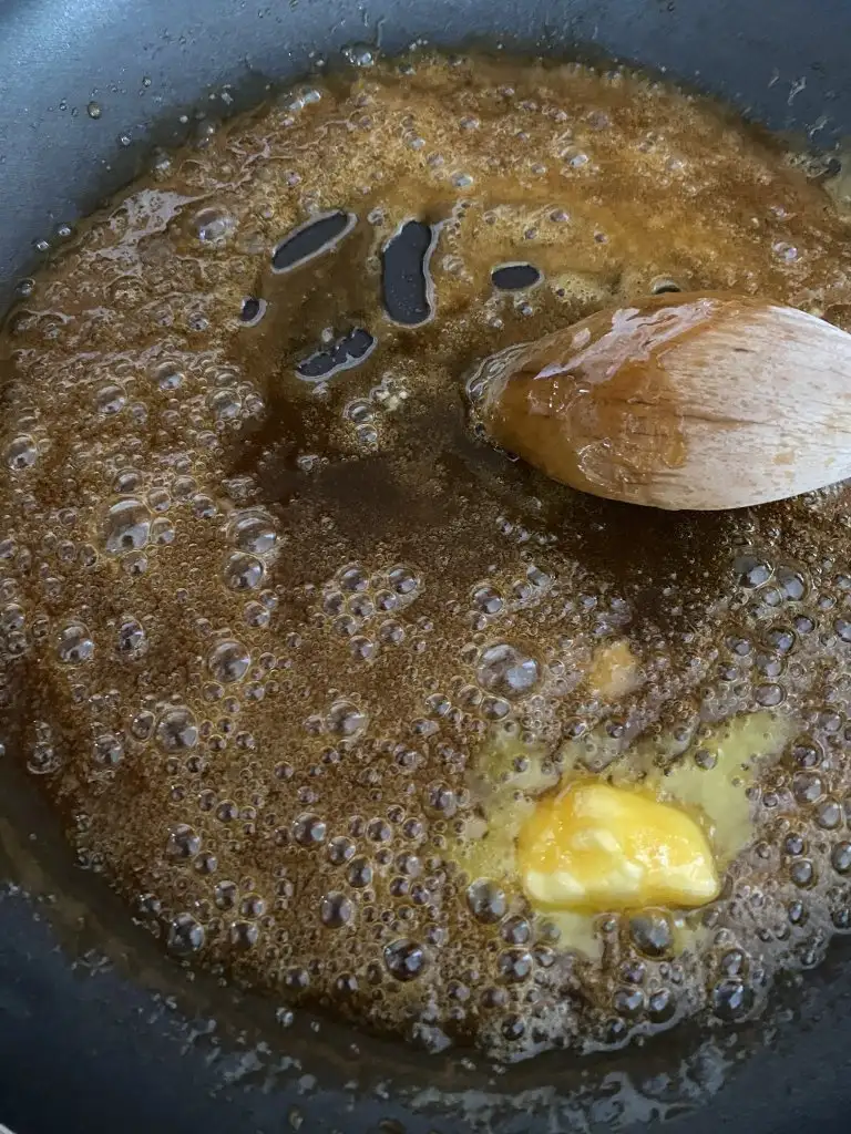 Badem pralin için şeker ve suyu bir tavaya alıp, karamel elde ediyoruz. Karamele 1 kaşık tereyağı ekleyip karıştırıyoruz ve bademleri ekleyip yağlı kağıtta soğutuyoruz.