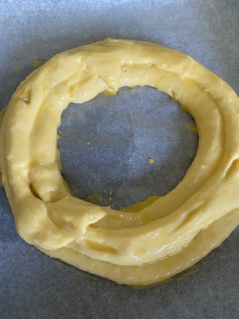 Yağlı kağıt serili tepsiye 20 cm çapında halka şeklinde hamurumuzu sıkıp, üzerine çırpılmış yumurta sürüp, file badem döküyoruz.