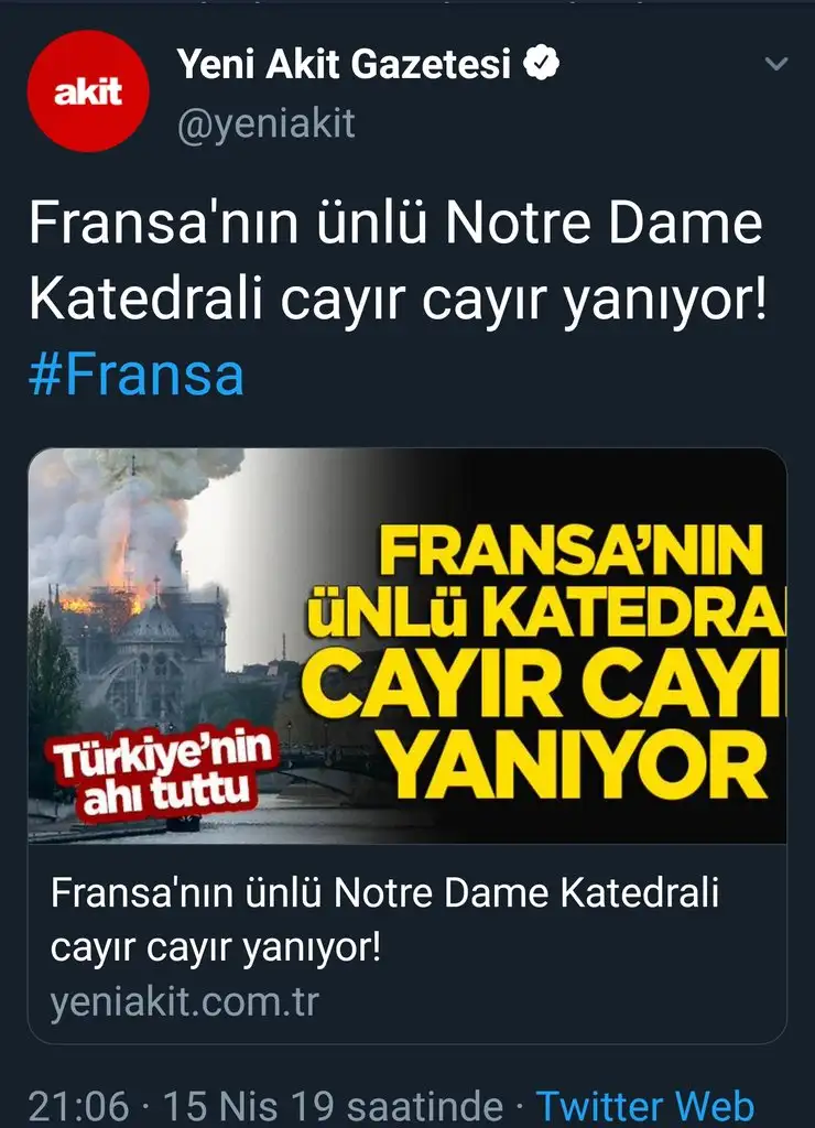 Fransa'nın başkenti Paris'te Notre Dame Katedrali'nde yangın çıktı. Fransa Cumhurbaşkanı Macron, Sarı Yelekliler ile ilgili konuşmasını iptal etti. ABD Başkanı Trump da yaptığı açıklamada, "Notre Dame Katedrali'ndeki yangını izlemek çok korkunç" dedi. Fransa'nın başkenti Paris'te Notre Dame Katedrali'nde çıkan yangının söndürülememesi nedeniyle çevre binaların tahliye edilmesine karar verildi.