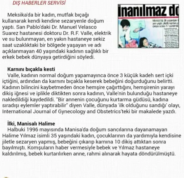 Hamile bir kadın,dogum vakti geldiğinde,diğer çocuklarının gözleri önünde karnını bıçakla kesiyor.Bebeği çıkarıyor.Yorgan ignesiyle karnını dikerken kan kaybından fenalaşıyor ve küçük kızına komşuyu çağırmasını söyleyip bayılıyor.Hastanede,bunu yapmasının nedeninide şöyle açıklıyor.Sancılara dayanamadım,bir an önce doğsun istedim.Çocuklarının kaskatı kesilmiş halde kameraya konuşmaları hala gözlerimin önünde.Şimdi "bu annedir,en iyisini o bilir" mi diyeceğiz?