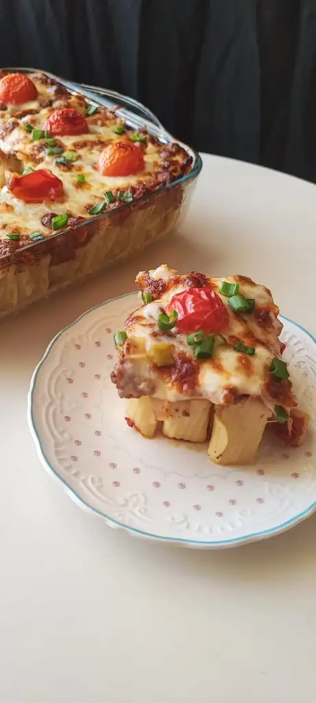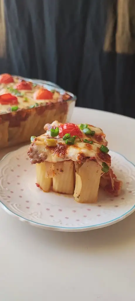 Yapılışı için tuzlu suyumuzu kaynatalım makarnamızı paket üzerinde yazan süre kadar haşlayalım(12 dk) diğer tarafta bir tavada soğan, kıyma, salça, domates, biber, baharatları kavurup sosu hazırlayalım. Makarnamızı dizip, sosu gezdirip, kaşar ve domates ekleyip 190 derece fırında kaşarlar kızarana kadar pişirelim.