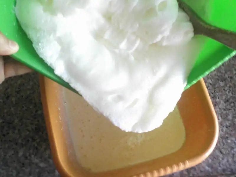 Yumurta aklarını sarılara tahta bir kaşık yardımıyla ekliyelim ve alttan üste doğru köpükleri söndürmeden karıştıralım.