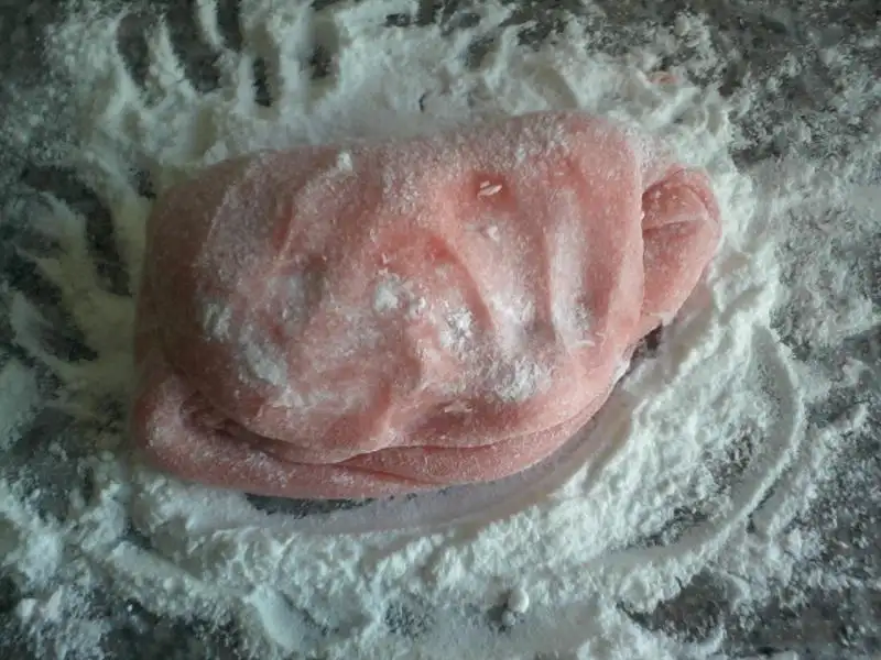 Ardından tezgaha bolca nişasta ve pudra şekeri ekleyip lokumlarımızı yoğuruyoruz ve bu işleme şeker hamurumuz kıvamına gelinceye kadar devam ediyoruz.