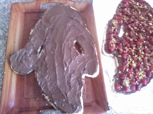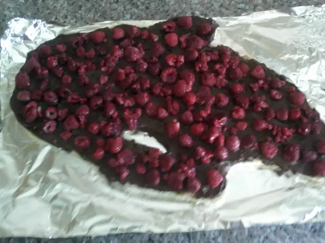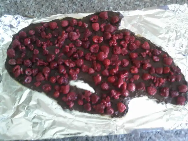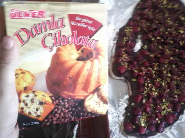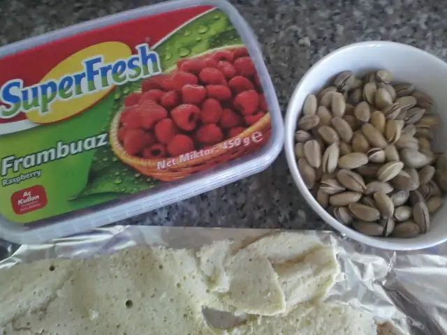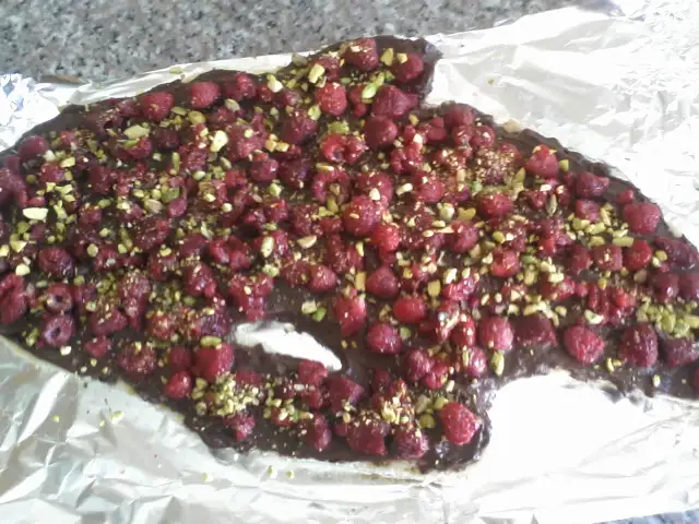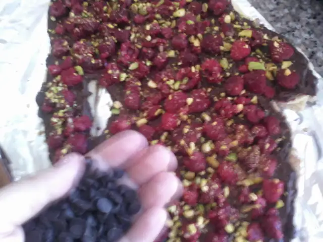 Frambuazların üzerlerine antep fıstıklarını serpip damla çikolatalarıde üzerlerine dağıttım.