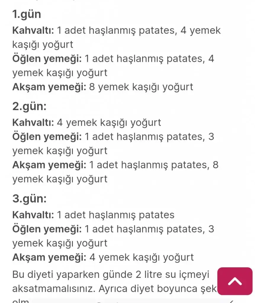 Ben yaptim patates diyetini 3 gunde tam 4.5 kilo verdim sunu fark ettim eger hic diyet yapmamissaniz baya kilo veriyorsunuz ama diyetle ugrasiyorsaniz birde sok diyet yapim diyosaniz fazla gitmiyor