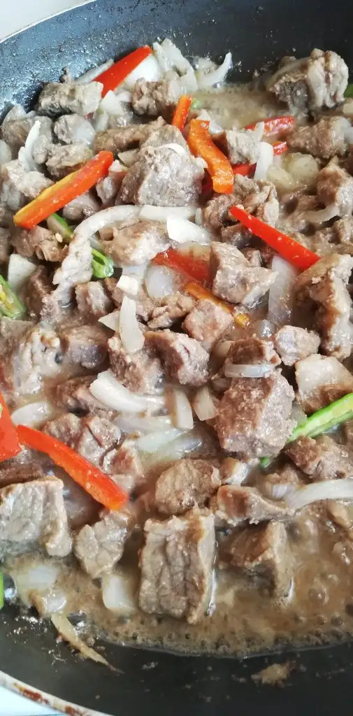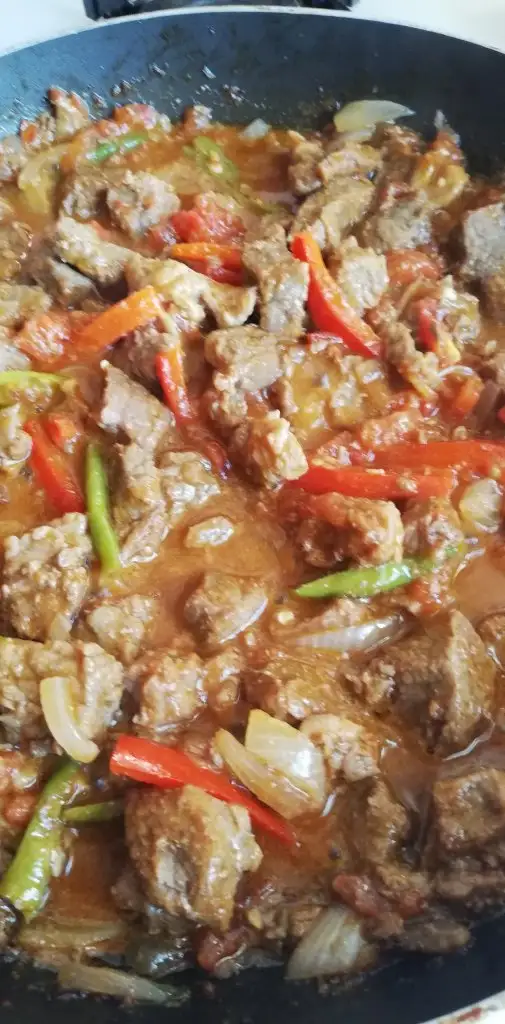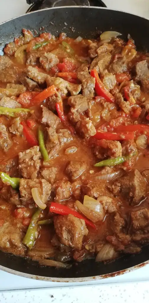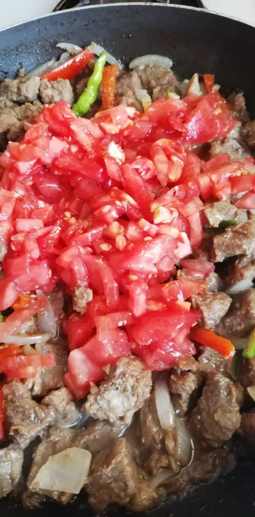 -Daha sonra pişen etlere sıvıyağı, doğranmış soğanı katıp biraz kavuruyoruz ve devamında biber ve domatesleri de katıp kavuruyoruz. Tuz ve baharatları da ekleyip ocaktan alıyoruz.