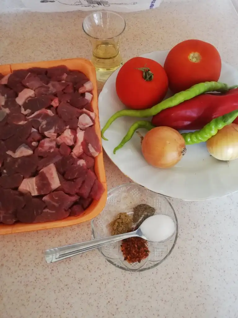 - Et pişerken soğan, biber ve domatesleri doğrayıp hazır ediyoruz.