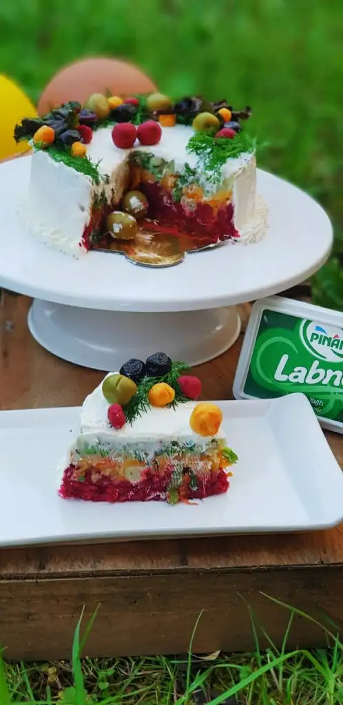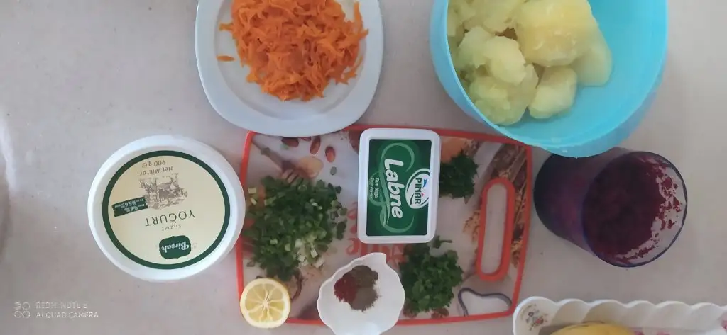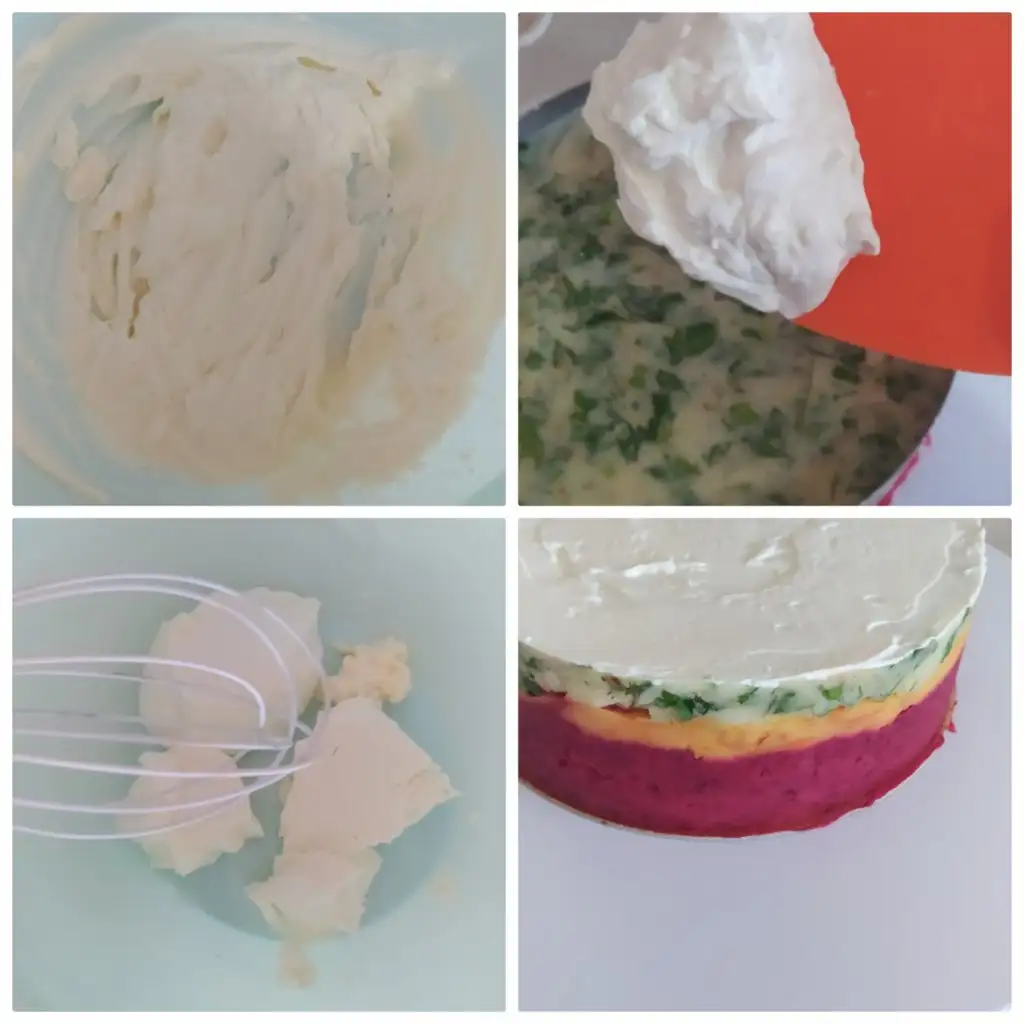 Patateslerimizi soyup haşlıyoruz.Havucumuzu rendeleyip az Z.yaginda soteliyoruz.Haslanan patateslerimizi z.yagi ve tuz ekleyip ezip 3e bölüyoruz.Hangi renk yoğun olsun isterseniz ona göre ayarlayabilirsiniz.pancarimizi soyup blendirdan geçiriyoruz.(isterseniz pancar turşusu kullanabilirsiniz)patatesli harcımızin birine pancar ,birine havuç, diğerine de yeşillik ve bahartlari ekleyip karıştırıyoruz.Tadlarina bakıp damak tadımiza göre tuz ve limon eklemesi yapıyoruz.Kalibimiza istediğimiz sırada harçları döküp dolapta yarım saat dinlendiriyoruz.Bir kapta labne, süzme yoğurt ve mayonez i çırpıyoruz.Dinlenen patates pastamızı yoğurt sosuyla kaplayip diledigimiz gibi süslüyoruz.