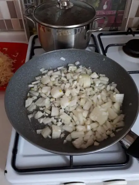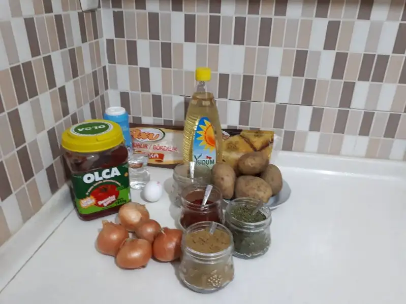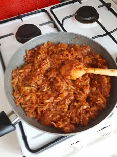 Patatesleri rendeledikten sonra kuru soğanları yemeklik doğruyoruz ve 3 yemek kaşığı sıvı yağda hafif pembeleşinceye kadar kavuruyoruz. Kavrulan soğanların üzerine suyu sürdürülmüş olan patatesleri ekleyip damak zevkinize göre baharatları ve salçayı ekleyip ara ara karıştırarak 10-15 dakika civarı kavuruyoruz.(ben bu böreği özellikle bol acılı ve bol salçalı çok severim oyüzden 3 çay kaşığı pul biber,2 çay kaşığı karabiber,1.5 çay kaşığı kimyon,1 çay kaşığı nane, 1.5 çay kaşığı tuz ve 2 kaşık salça koydum)