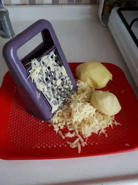 Ilk başta patatesleri ve soğanları soyuyoruz. Soyduğumuz patatesleri rendeliyoruz.Rendelenen patatesler suyunu bırakıyor o suyu süzdürmek gerekiyor.Ben patatesleri özellikle delikli bir kabın içine rendeledim delikli kapta olunca sular kendiliğinden akıp gitti birdaha süzmeye gerek kalmamış oldu.