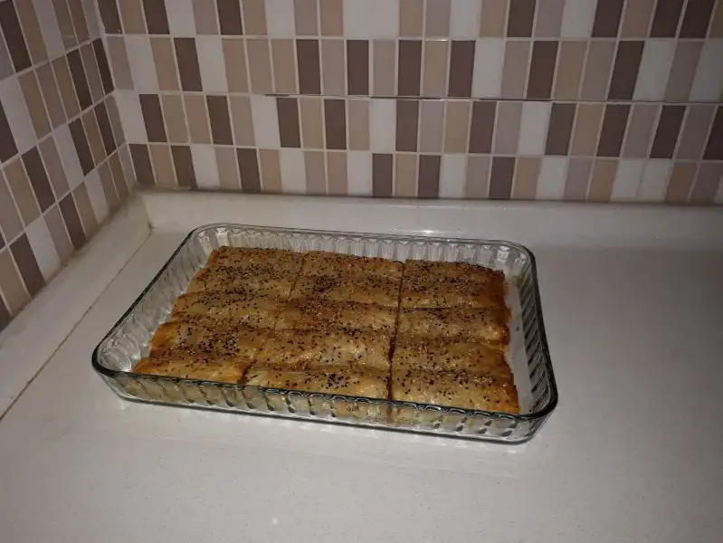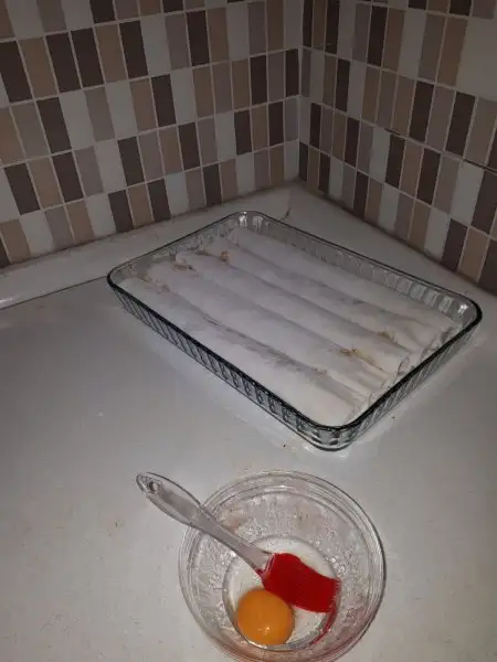 2 yufkayı tezgaha serip yağlı sulu karışımı fırça yardımıyla yufkanın üzerine damlatiyoruz sonra 3. yufkayı serip onu da fırça yardımıyla hafif ıslatıyoruz. Daha sonra iç malzemeyi yufkanın ceyreğine kadar yayıp rulo halinde dürüp yağlı kağıt serilmiş tepsiye yerleştiriyoruz. Diğer yufkalarla da aynı islem yapılıp tepsiye diziyoruz.