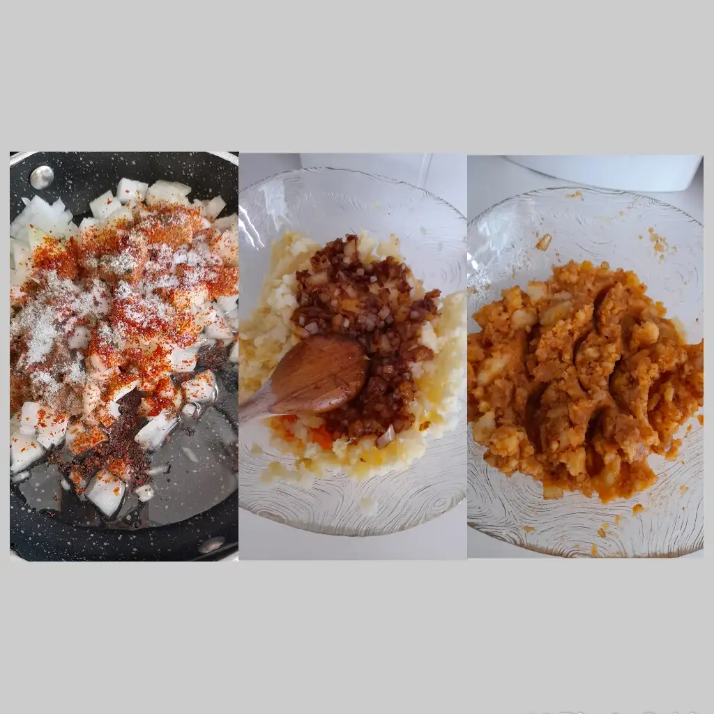 önce Patates imizi haşlayalım sonra haşlama bittimi ezelim ayrı tavaya soğanı pulbiber karabiber sıvıyağ yapalım soğan ölene kadar kavuralım