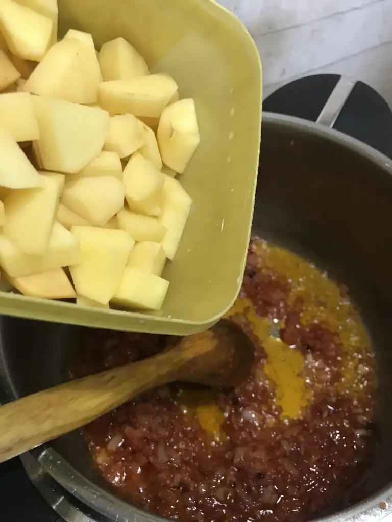 Küp küp doğramış olduğunuz patatesi ilave ederek 1-2 dakika kadar daha kavuralım.
