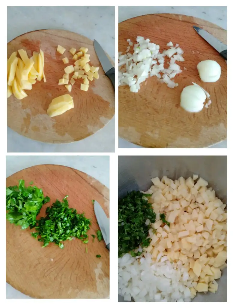 Patates ve soğanı küp küp doğruyoruz. Maydanozu ince ince doğruyoruz ve hepsini bir kaba alıyoruz.