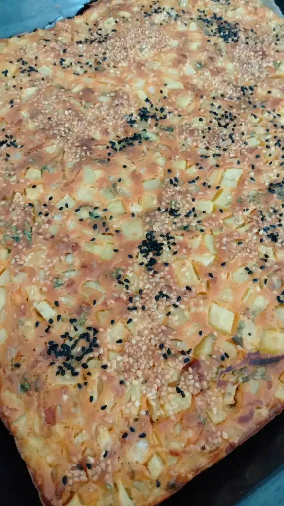 Pişirme kağıdı serdiğimiz fırın kabına harcı boşaltıp düzeltiyoruz. İsterseniz yağladığınız borcama veya pişirme kabına koyabilirsiniz. Üzerine susam, çörekotu seriyoruz.