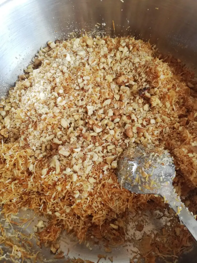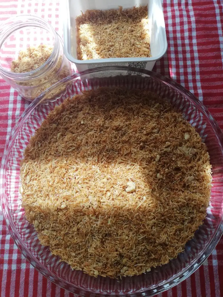- Son olarak cevizimizi ekleyerek az daha kavurup ateşten alalım. Kadayıfları ocaktan aldıktan sonra tavadan ayrı bir kaba alalım ki, tavanın sıcaklığıyla tekrar kavrulmasın.