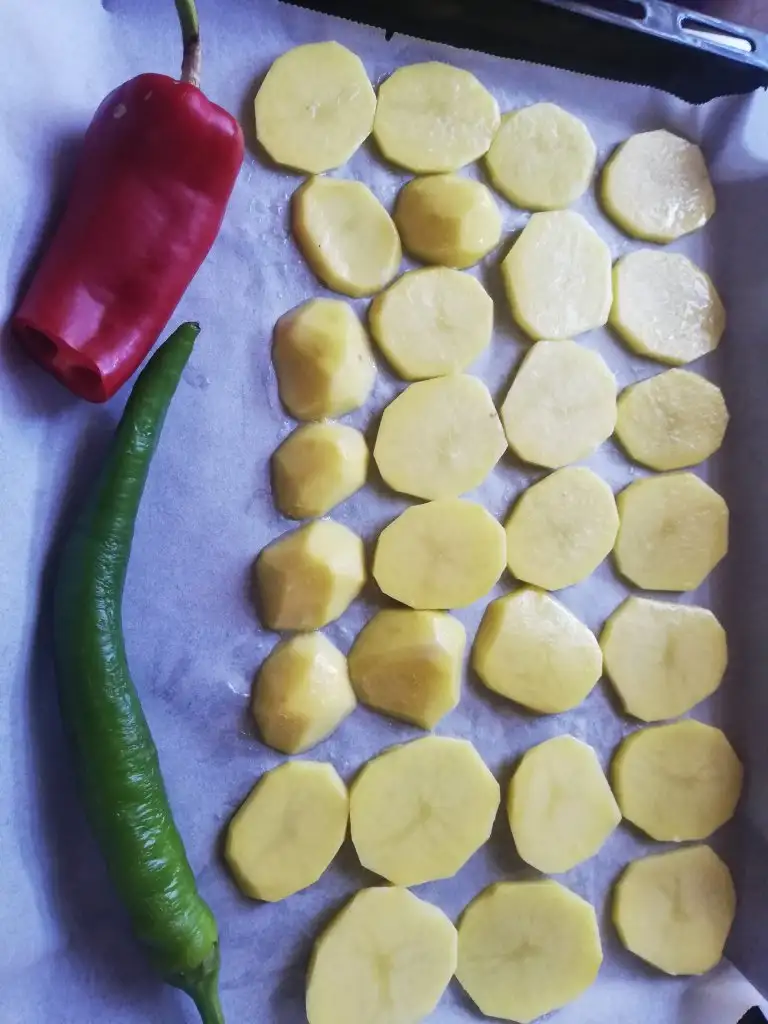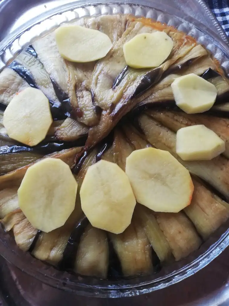 - Son olarak bir sıra daha patates dilimi yerleştirerek patlıcanları üzerine kapatalım.