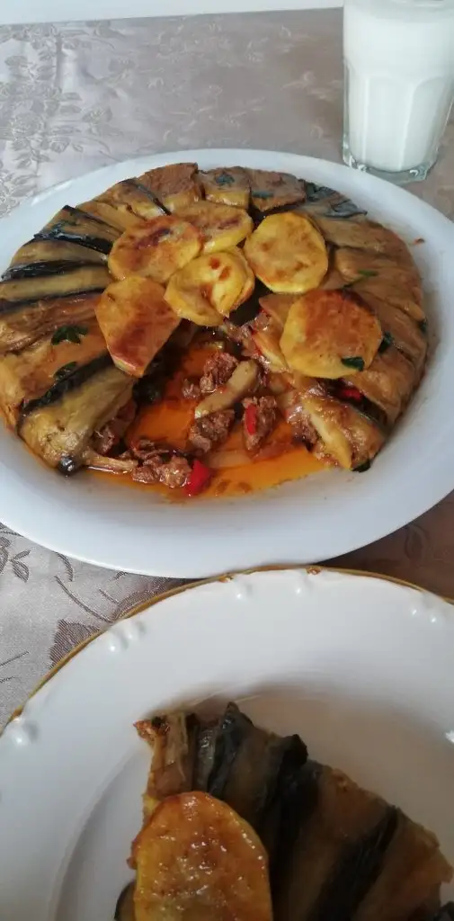 - Daha sonra ocaktan alalım. Patlıcanları çizgili soyarak ince şeritler halinde dilimleyelim.Ben patatesleri de fırına attım yuvarlak dilimler halinde. Dilerseniz kızartma bilir veya ince dilimler halinde çiğ de koyabilirsiniz.