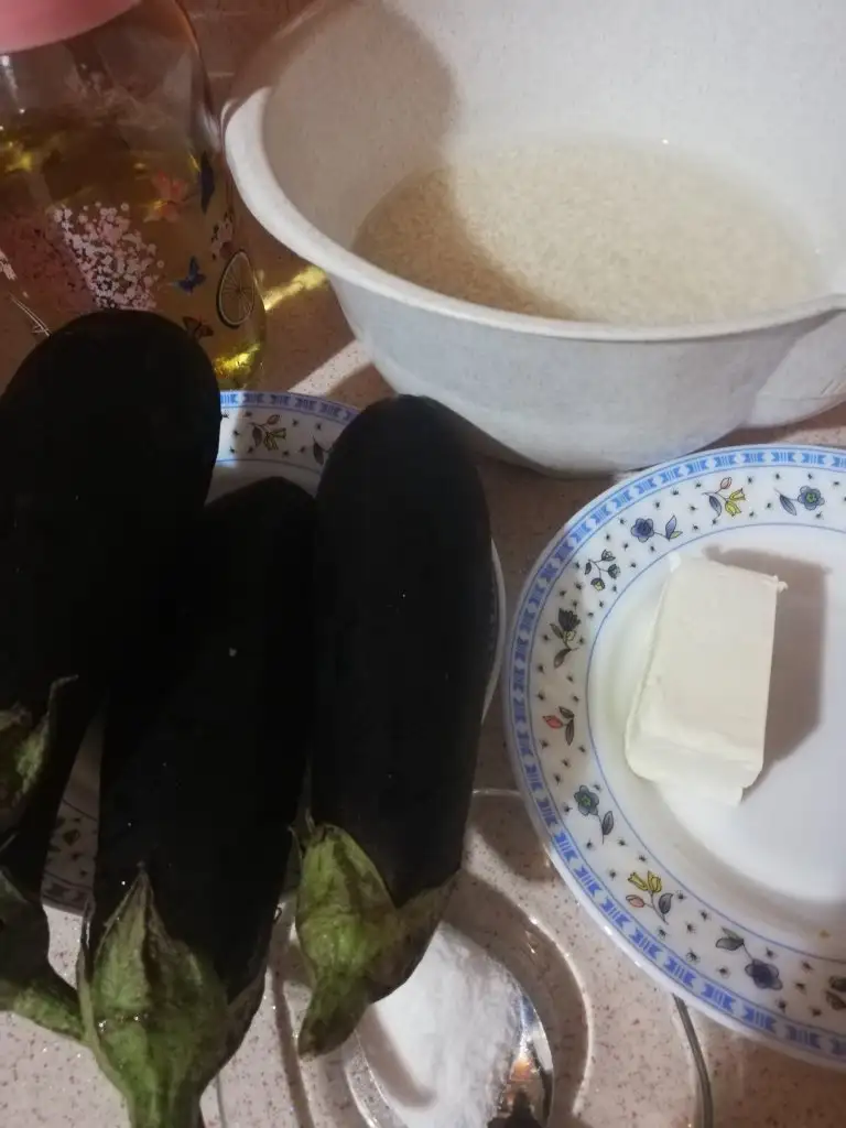 -Hazırlık için önceden pirincimizi suda bekletiyorum yarım saat kadar, patlıcanları alacalı soyup ince ince dilimleyip tuzlu suda bekletiyoruz.