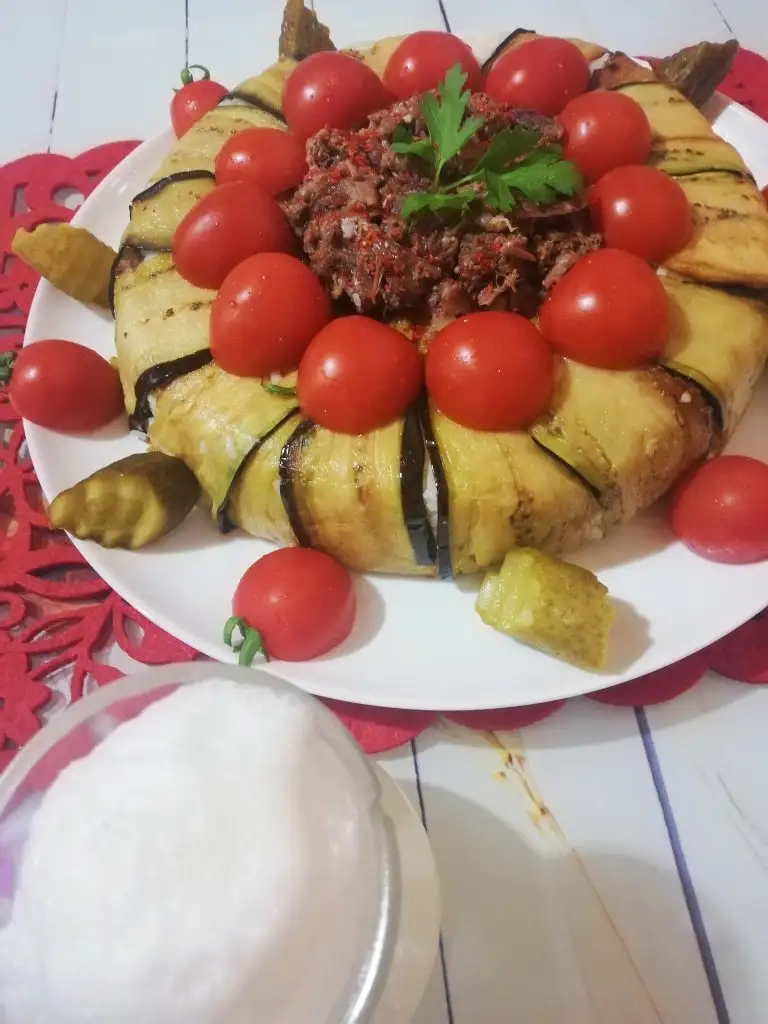 -Kızaran patlıcanları şekil vereceğimiz kaba Yan yana dizip üstüne pilav koyup, sarkan patlıcanları üstüne kapatıyoruz.