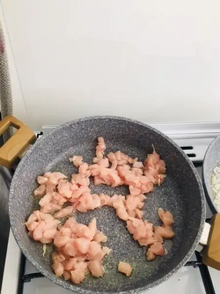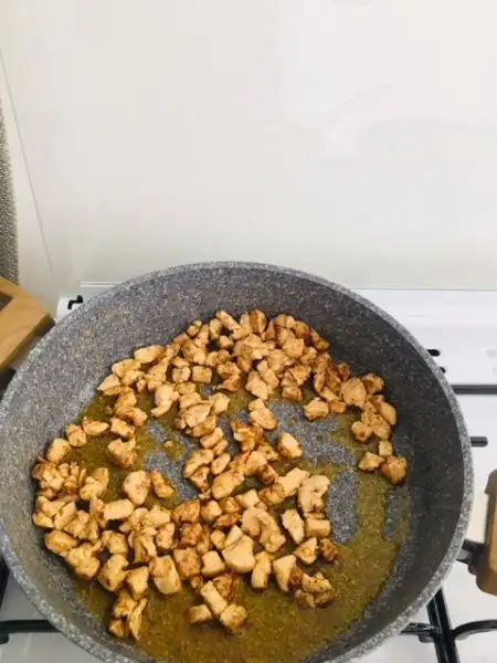Başka bir tencerede küçük küçük doğranmış tavuk göğüslerimizi kavurup baharatlandırıp altını kapatıyoruz.
