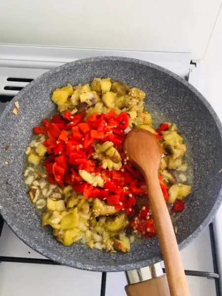 Daha sonra biber ve patlıcanları soyup küp küp doğrayarak soğanın üzerine ekleyip bir süre daha kavurup altını kapatıyoruz.