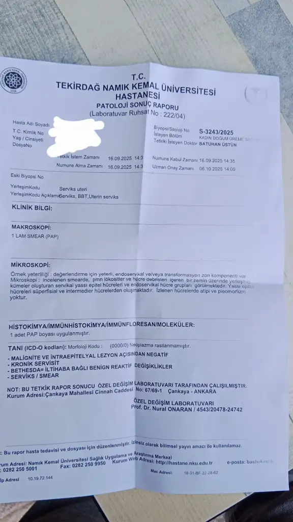 Sonuç: Rapor, kanser veya öncüsü bir duruma işaret etmiyor. Ancak kronik servisit mevcut olduğu için bu, doktor tarafından takip edilmesi gereken bir durumdur. Tedavi gerekebilir ama ciddi bir tabloya işaret etmiyor.