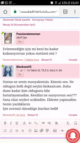 Ya evlenemediğin için bu kadar koca konusuna vurgu yapıyorsun sanırım kocanı da getir bilmem ne :KK66: kimin zararlı çıkıp çıkmayacağını da göreceksin hakaret ne kelime hala daha kendince küçük aklınla tehdit ediyorsun asıl sen kimsin ki dışarda beni görsen iki kelimeyi bir araya getiremezsin buradan atıp tutuyorsun anca ama merak etme tanışacağız haddini fazlasıyla aştın