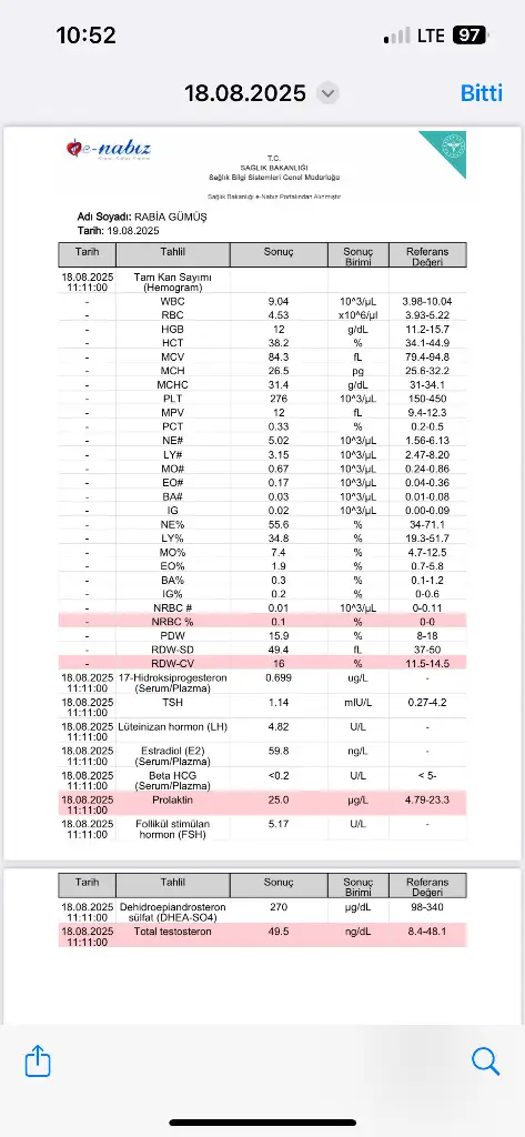 Lh/fsh oranı pcosta 1'den büyük olur sizinki normal, bence pcos olmama ihtimaliniz de var gibi. Chatgpt ye de sordum o da kesin tanı koyamadı, prolaktin ve testesteron çok az yüksek çıkmış onun dışında normal. Bence başka bir endokrinologa daha gorunebilirsiniz ikinci bir görüş için. Geçmiş olsun