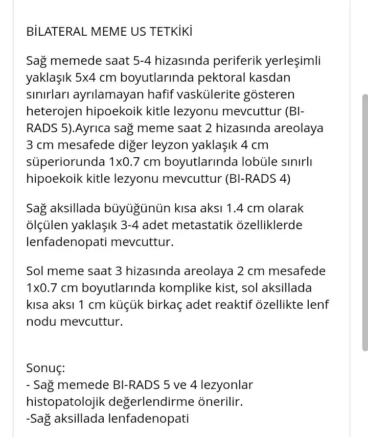 Mrb arkadaşlar dün annem göğsünden ultrason çekindi ve biyopsi istendi pazartesi sabah biyopsi olacak çok korkuyoruz doktor ciddi gibi görünüyor ama herşeyin tedavisi var korkma demiş sonuçları yazsam anlayan varsa lütfen yazar mı çok tedirginim İnternetden araştırdıkça da kafam Allak bullak oluyor..