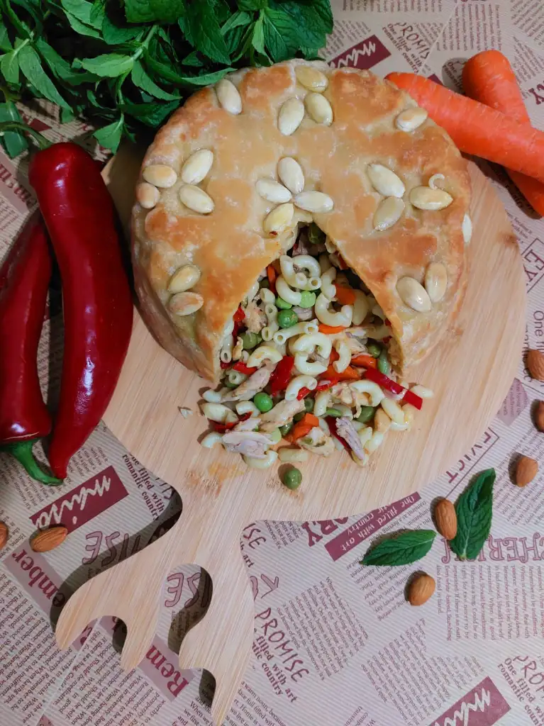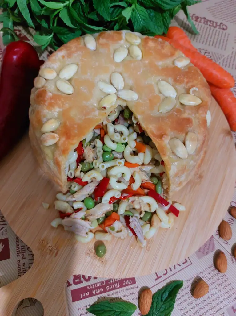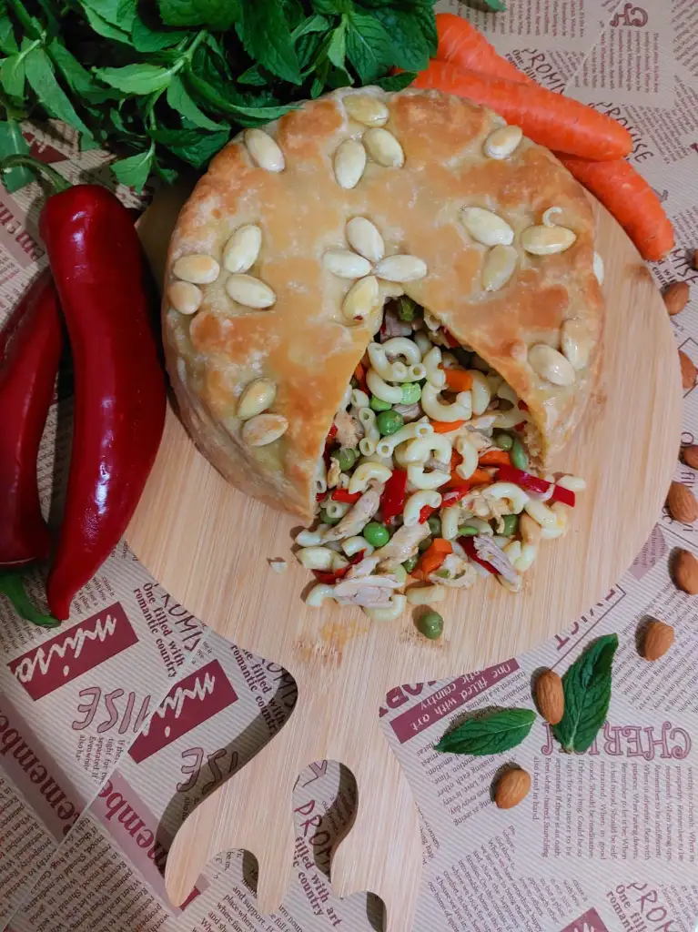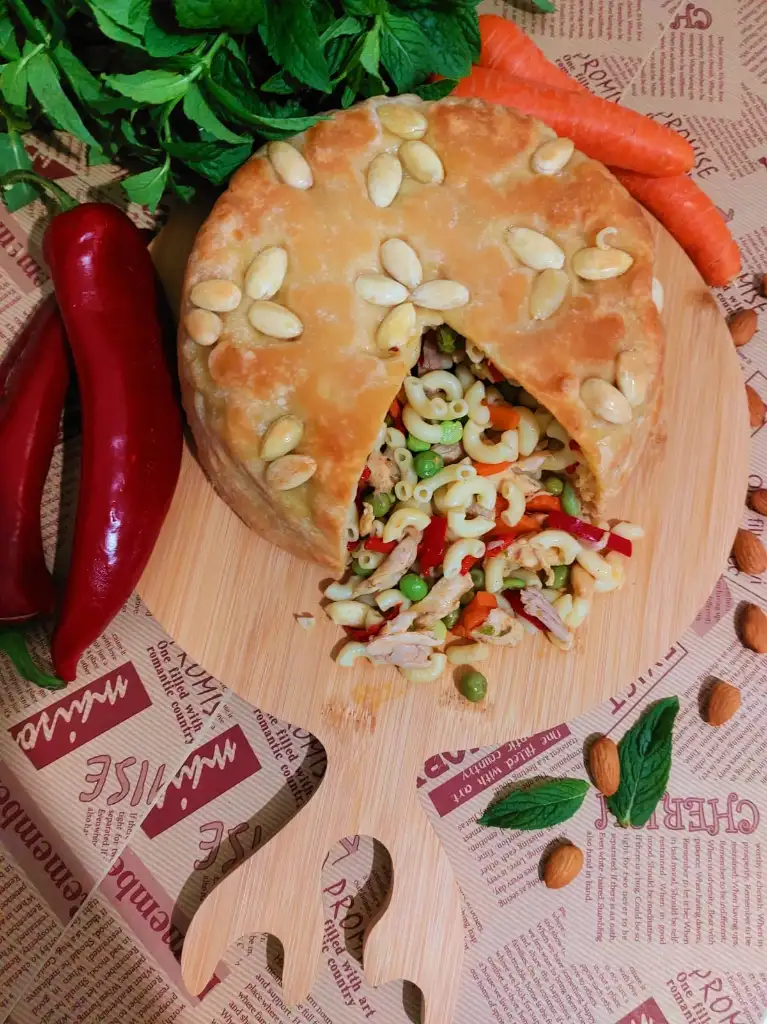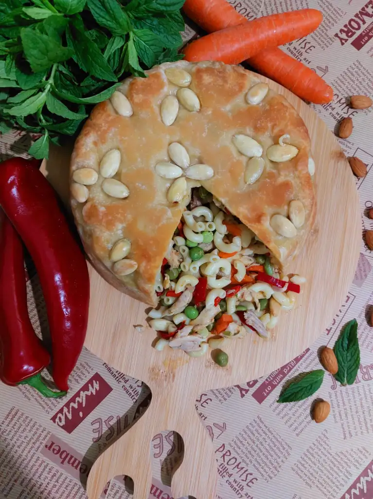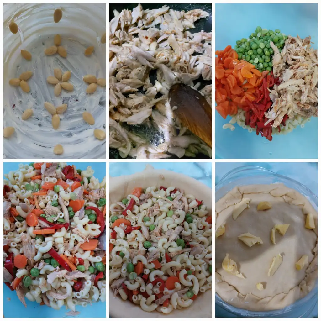 hamur için tüm malzemeleri karıştırıp hamur yoguruyoruz. Biri büyük biri küçük ikiye böluyoruz. ( küçük hamur kapak için) Kalıp büyüklüğünde hamurumuzu açıyoruz . Kaliba bol margarin ya da tereyağ sürüp bademleri istediğimiz şekilde kalıba yapistiriyoruz. Büyük Hamuru kalibimiza yavaşça yerleştiriyoruz. Makarnamizi kalıba boşaltıyoruz. Küçük hamurdan kapak açıyoruz. Makarnanın üzerini kapatıp kenarlarindan hamurlari kapatıyoruz. Üzerine parça tereyağ koyuyoruz. 180 ° fırında 50 dakika hamur kızarana kadar pişiriyoruz.