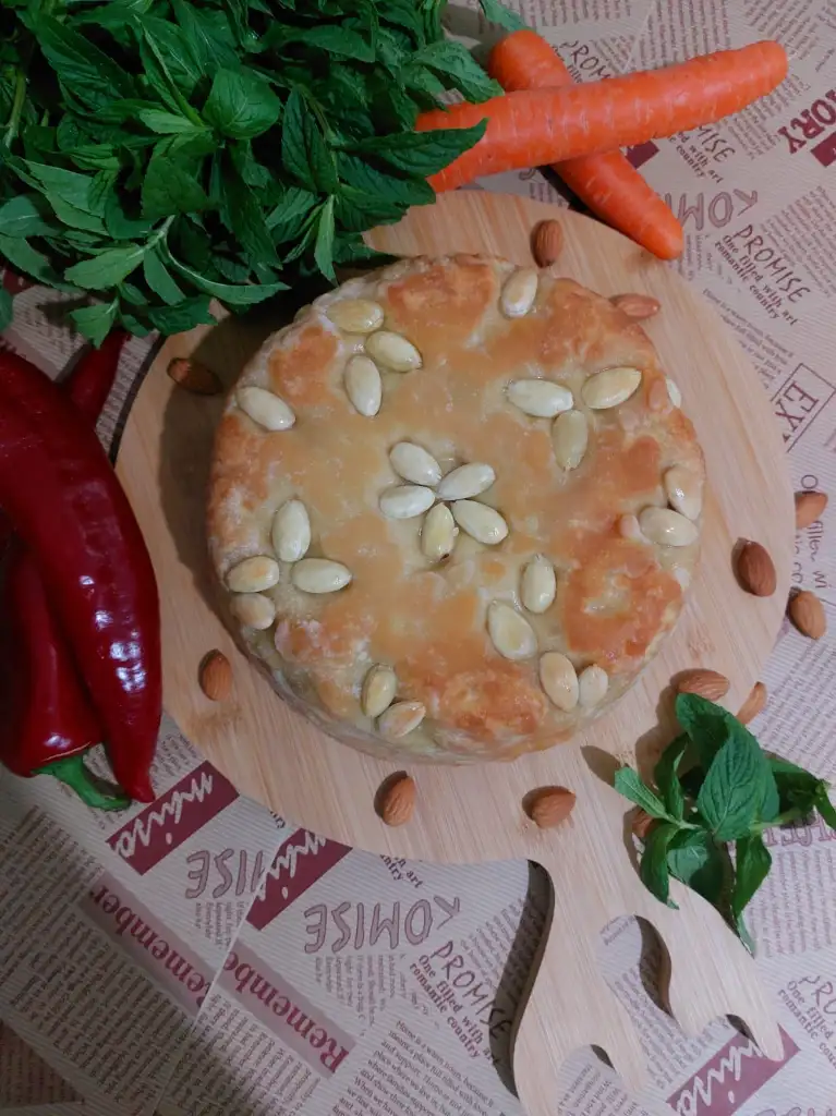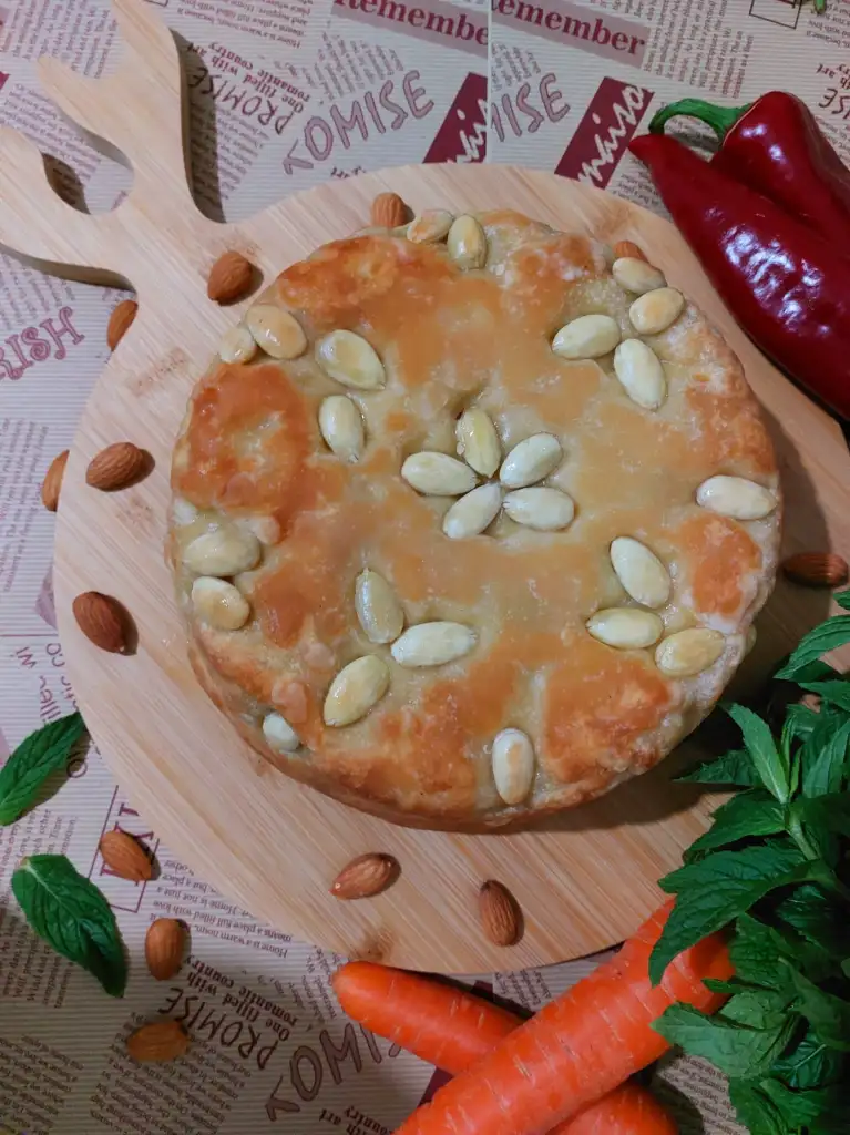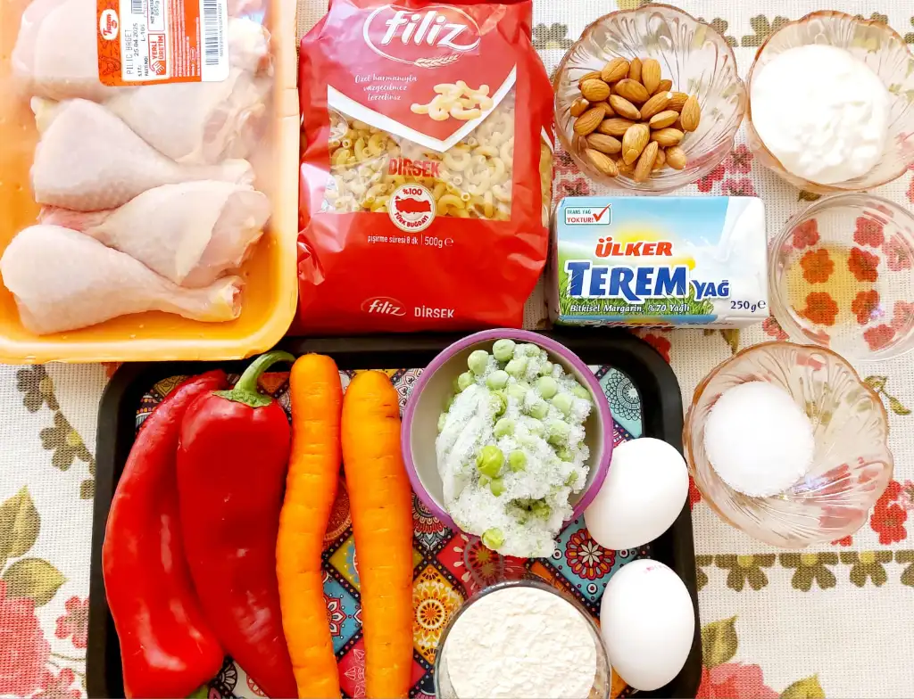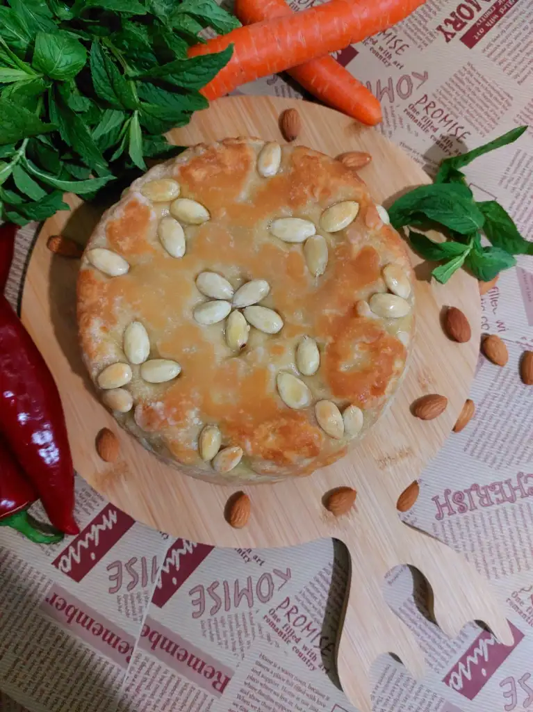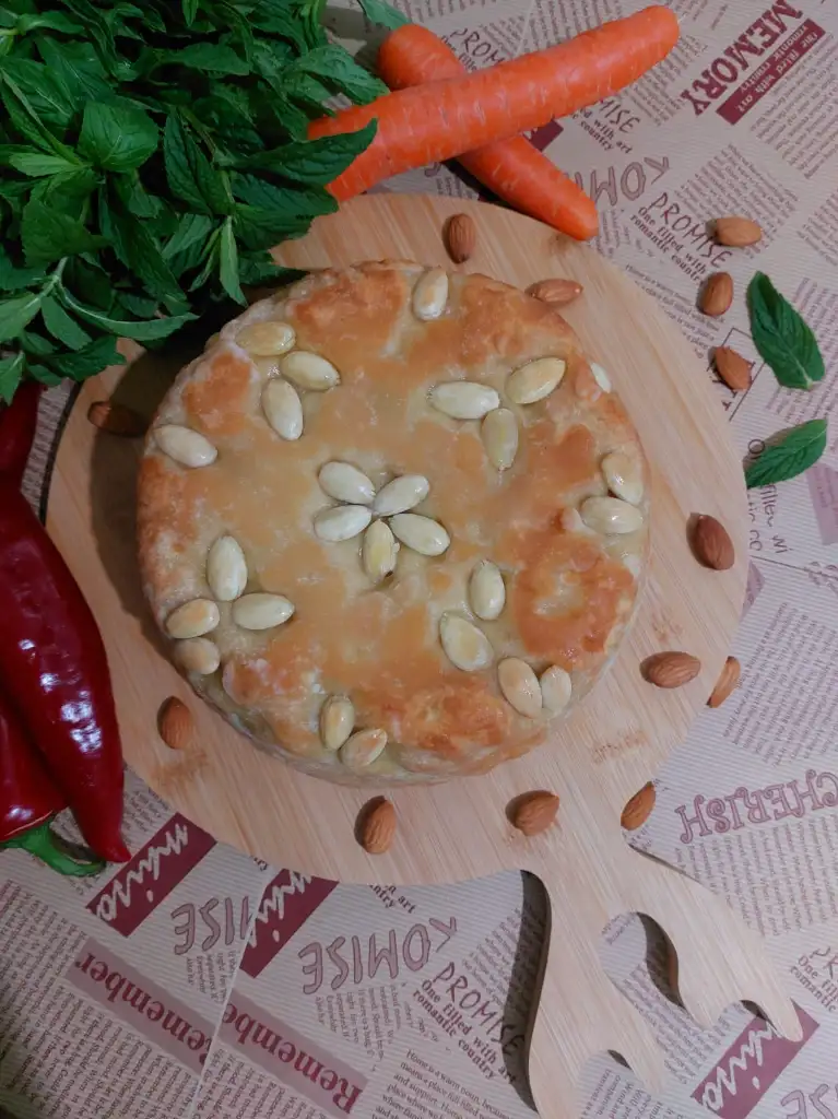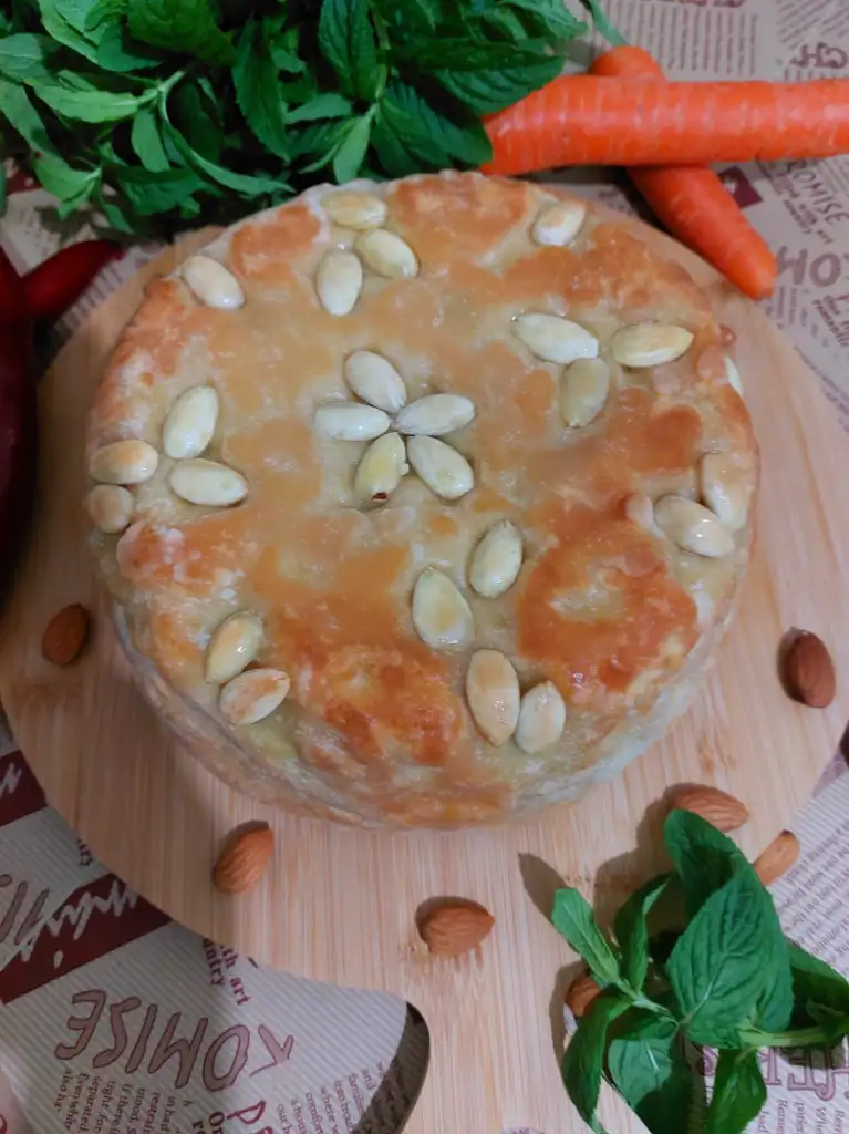 hamur için tüm malzemeleri karıştırıp hamur yoguruyoruz. Biri büyük biri küçük ikiye böluyoruz. ( küçük hamur kapak için) Kalıp büyüklüğünde hamurumuzu açıyoruz . Kaliba bol margarin ya da tereyağ sürüp bademleri istediğimiz şekilde kalıba yapistiriyoruz. Büyük Hamuru kalibimiza yavaşça yerleştiriyoruz. Makarnamizi kalıba boşaltıyoruz. Küçük hamurdan kapak açıyoruz. Makarnanın üzerini kapatıp kenarlarindan hamurlari kapatıyoruz. Üzerine parça tereyağ koyuyoruz. 180 ° fırında 50 dakika hamur kızarana kadar pişiriyoruz.
