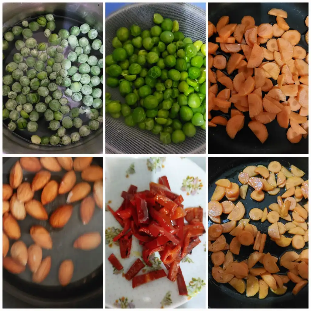 Havuclari ince ince dilimleyip yağda biraz kavuruyoruz . Biberleri istediğimiz boyda doğrayıp hafif yağda kavuruyoruz. Bezelyeleri suda hasliyoruz. Bademleri sıcak suda bir dakika kaynatıp soğuk suda bekletip kabukları soyuyoruz. Tavukları didikleyip toz biber ve tuzda tereyagda hafif kavuruyoruz. Tüm malzemeleri hazırlayıp karıştırıyoruz.