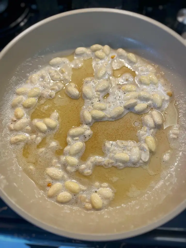 Pilavı için tencereye tereyağı ve sıvı yağ ilave edelim. Eriyince bademleri ekleyip hafif kavuralım. Daha sonra dolmalık fıstıkları da ekleyelim