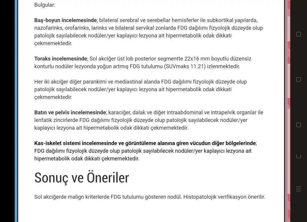 Pet raporundan anlamıyor olsam da sonuç kısmını yorumlamaya çalışırsam sol akciğerde bir kitle olduğu ve patolojik inceleme yani iyi huylu mu kötü huylu mu olduğunun analizinin yapılması istenmiş. Çok geçmiş olsun
