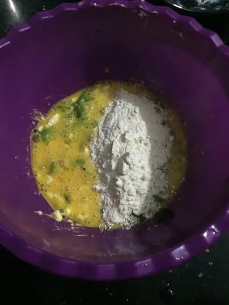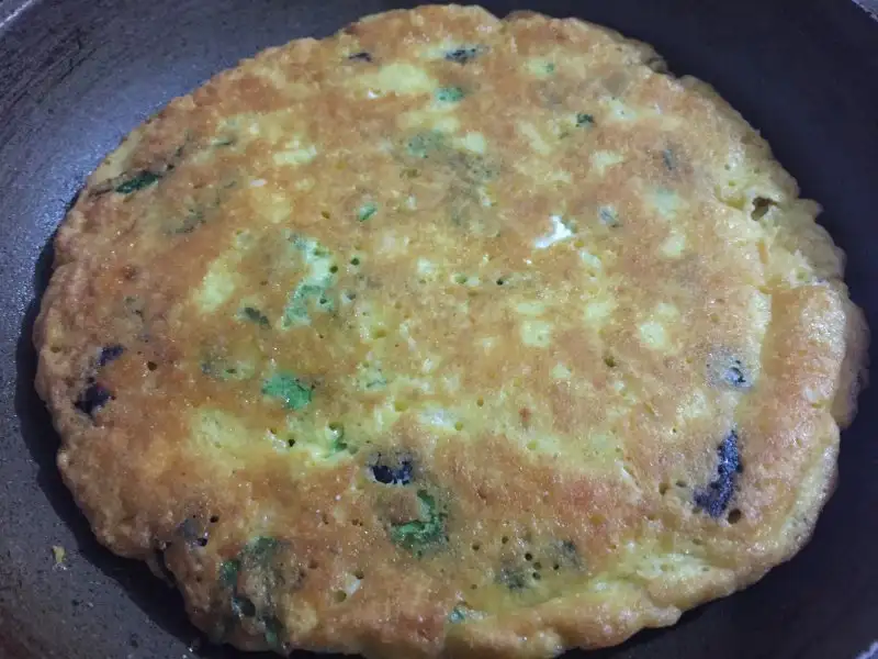 Yumurtaları kırıp çırptıktan sonra peynir zeytin ve maydanozuda ekleyip karıştırıyoruz ve yağlanmış tavada arkalı önlü pişiriyoruz. Dilimleyip servis yapıyoruz